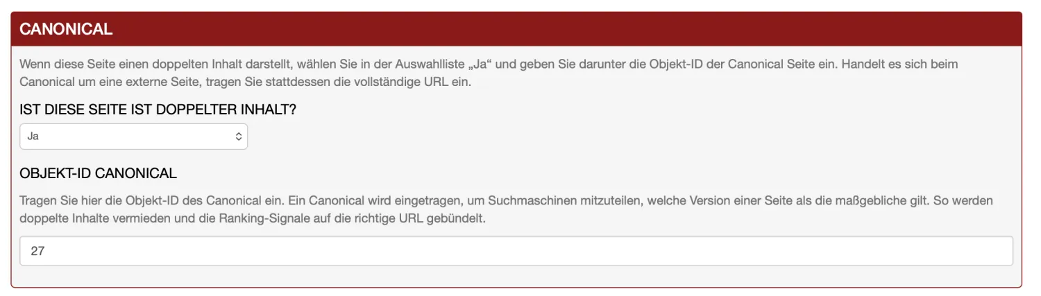 If the page is the original content, no canonical needs to be entered. In this case, the zCMS automatically generates a self-referential canonical.